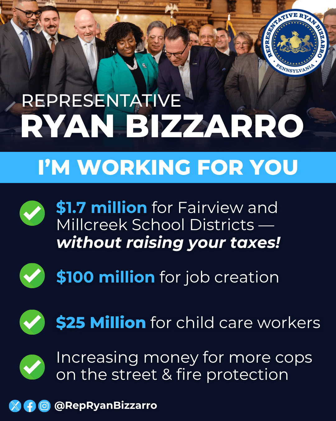 My team and I are always working for you! My Millcreek office at 1101 Peninsula Drive, Suite 213, Erie is open Monday through Friday from 8:30 a.m. to 4:30 p.m. You can also call 814-835-2880 or email RepBizzarro@pahouse.net if you need help with state government concerns.