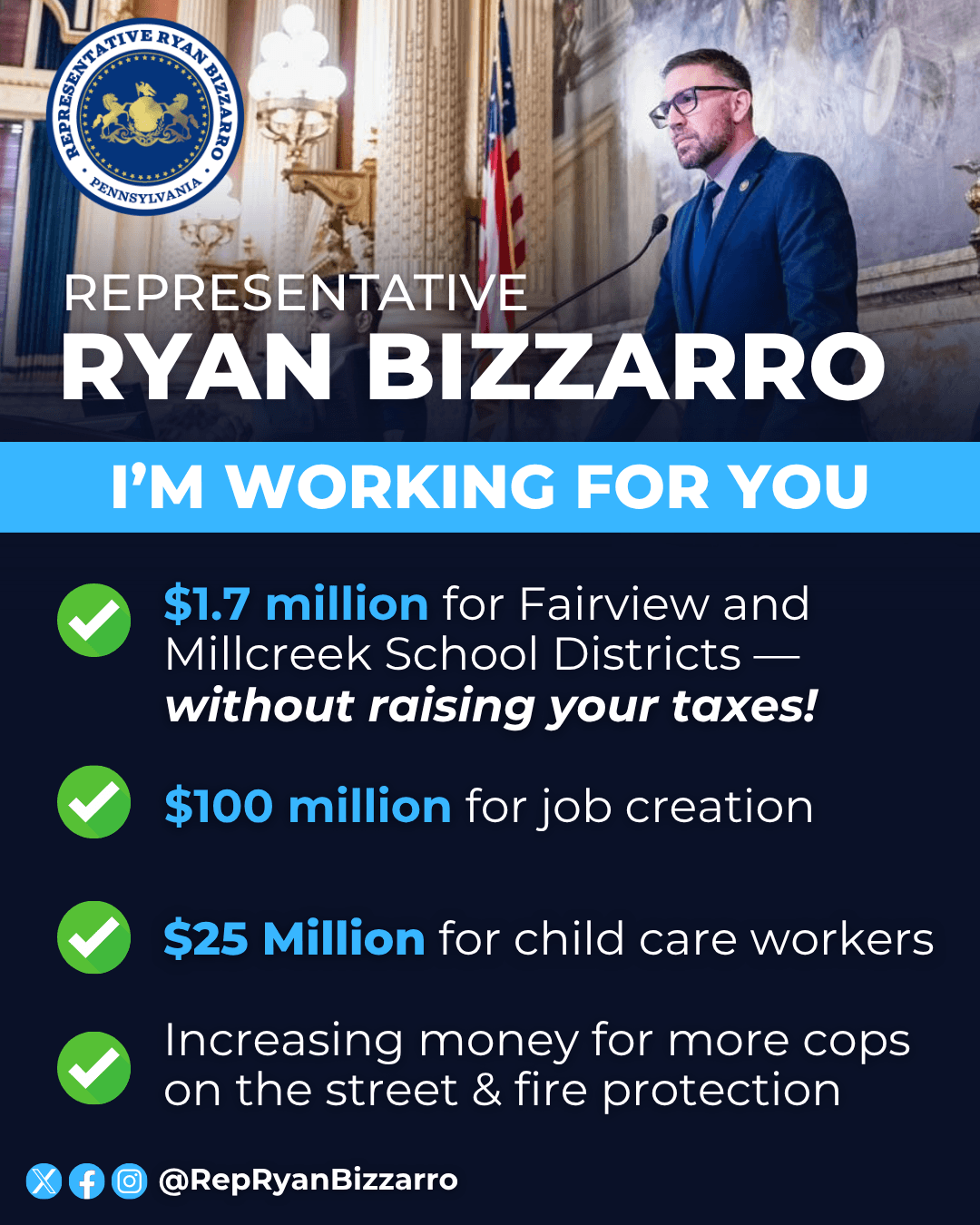 My team and I are always working for you! My Millcreek office at 1101 Peninsula Drive, Suite 213, Erie is open Monday through Friday from 8:30 a.m. to 4:30 p.m. You can also call 814-835-2880 or email RepBizzarro@pahouse.net if you need help with state government concerns.