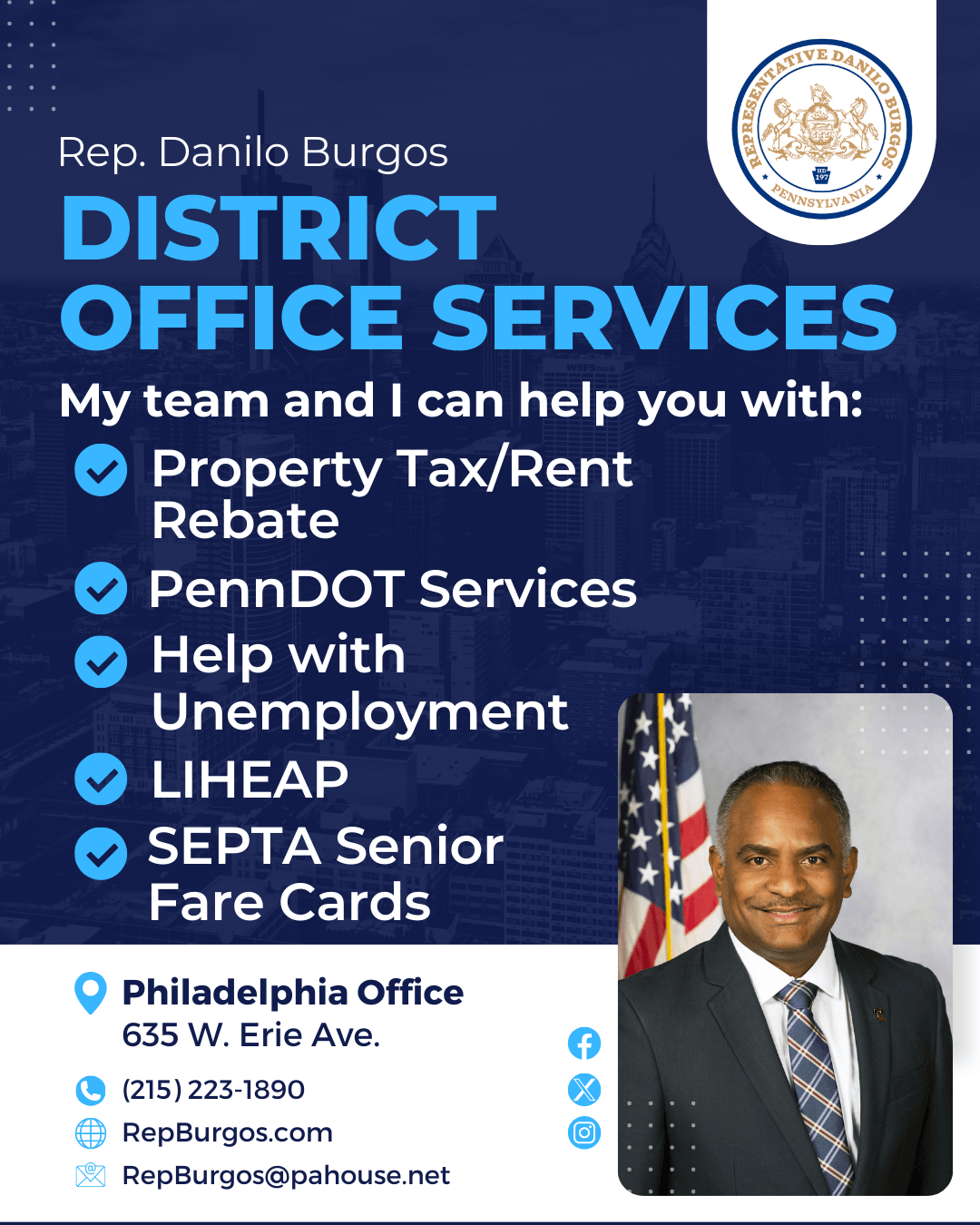 Please stop by my Philadelphia office (635 W. Erie Avenue), call us at (215) 223-1890 or email RepBurgos@pahouse.net to learn more about the services we offer and get started!