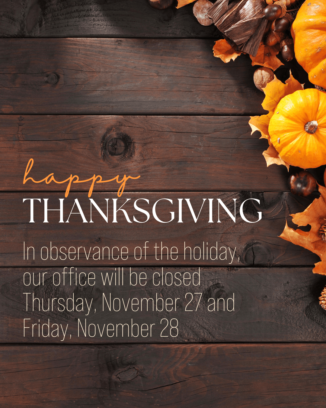 In observance of Thanksgiving, my office will be closed Thursday, Nov. 27 and Friday, Nov. 28. We will reopen for our regularly scheduled hours on Monday, Dec. 1.