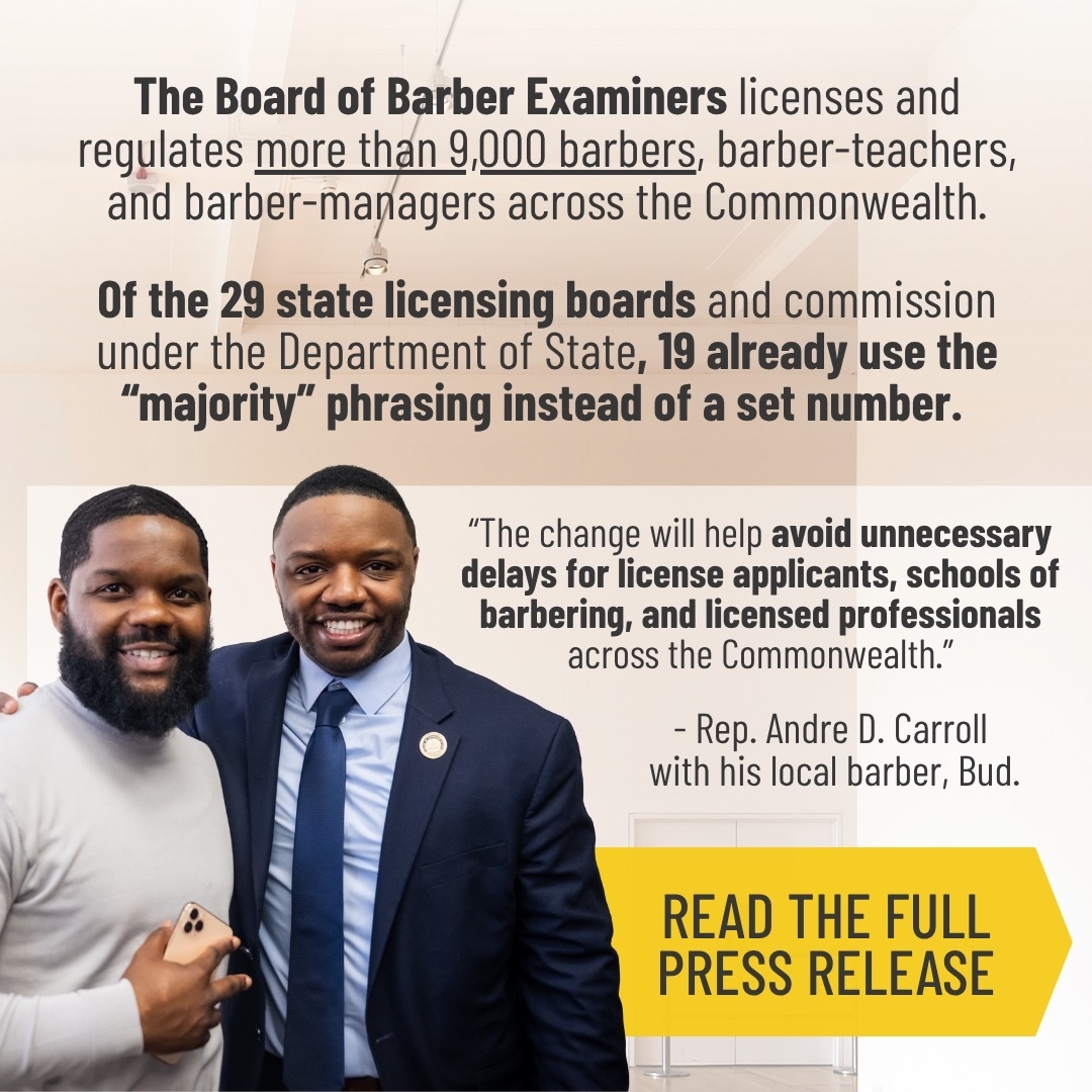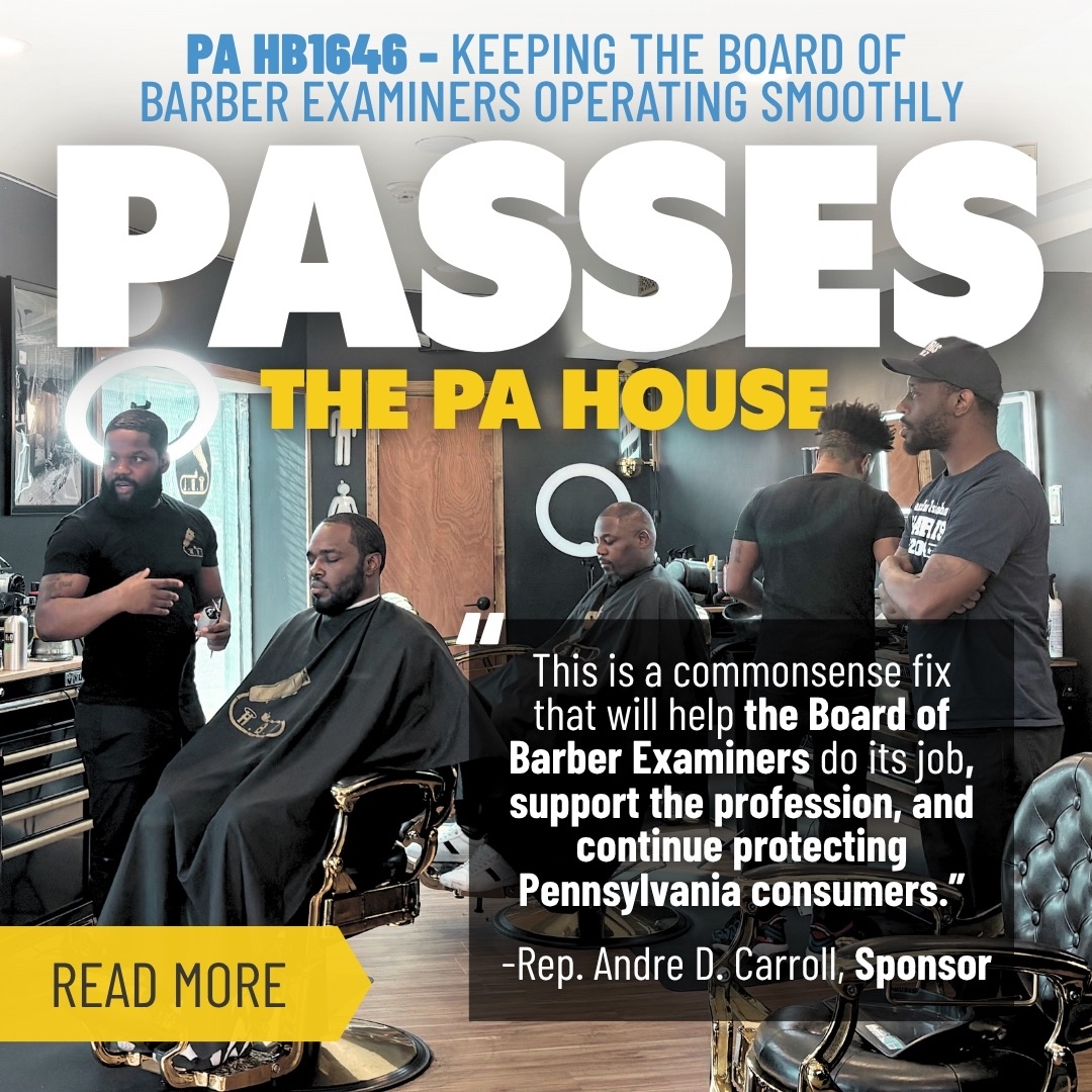 My house colleagues and I have passed my bill—HB 1646--this week. This bill would help keep Pennsylvania’s barbering profession running efficiently by updating rules for the State Board of Barber Examiners.