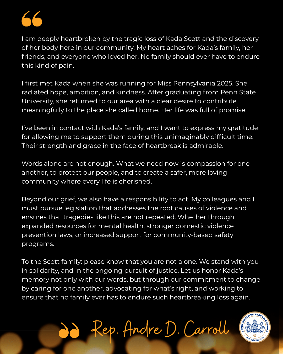 “I am deeply heartbroken by the tragic loss of Kada Scott and the discovery of her body here in our community. My heart aches for Kada’s family, her friends, and everyone who loved her. No family should ever have to endure this kind of pain.   I first met Kada when she was running for Miss Pennsylvania 2025. She radiated hope, ambition, and kindness. After graduating from Penn State University, she returned to our area with a clear desire to contribute meaningfully to the place she called home. Her life was full of promise. I’ve been in contact with Kada’s family, and I want to express my gratitude for allowing me to support them during this unimaginably difficult time. Their strength and grace in the face of heartbreak is admirable.   Words alone are not enough. What we need now is compassion for one another, to protect our people, and to create a safer, more loving community where every life is cherished. Beyond our grief, we also have a responsibility to act. My colleagues and I must pursue legislation that addresses the root causes of violence and ensures that tragedies like this are not repeated. Whether through expanded resources for mental health, stronger domestic violence prevention laws, or increased support for community-based safety programs.   To the Scott family: please know that you are not alone. We stand with you in solidarity, and in the ongoing pursuit of justice.   Let us honor Kada’s memory not only with our words, but through our commitment to change by caring for one another, advocating for what’s right, and working to ensure that no family ever has to endure such heartbreaking loss again.”   -Rep. Carroll  |