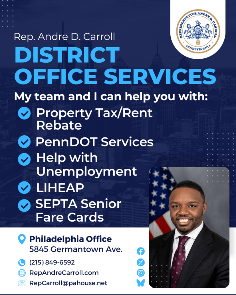 On October 29th, my office will be partnering with the Register of Wills and Clerk of the Orphans’ Court. They will provide all their services, including birth certificate and marriage certificate replacements, as well as assistance with wills. The event will take place at my district office, located at 5845 Germantown Avenue. |