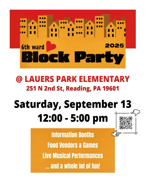 I will be attending the 6th Ward’s upcoming Block Party at Lauers Park Elementary, 251 N. 2nd St. in Reading this Saturday, September 13 from 12 PM – 5 PM. My staff and I will have state resource information available for the community. There will also be food, music, vendors, and more! I look forward to seeing you all there!