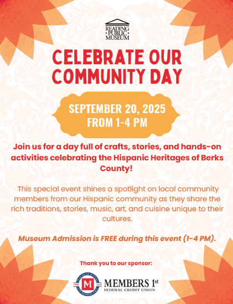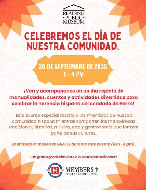 The Reading Public Museum will host a Hispanic Heritage celebration on September 20 from 1 PM – 4 PM at 500 Museum Rd. There will be FREE museum admission, local community groups, educational activities and demonstrations.