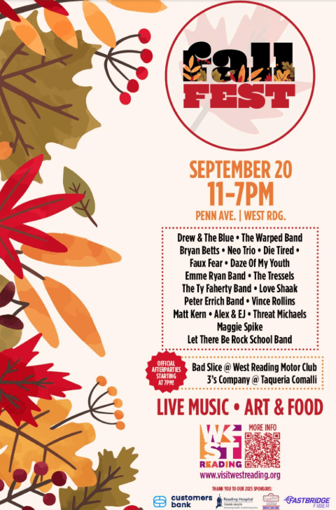 West Reading’s Annual Fall Fest will be on September 20 from 11 AM – 7 PM, spanning the 400-700 blocks of Penn Avenue. The streets will be closed so festival goers can indulge in 200 craft and retail vendors, including a wide array of food and beverage choices, and there will be live music on three stages!