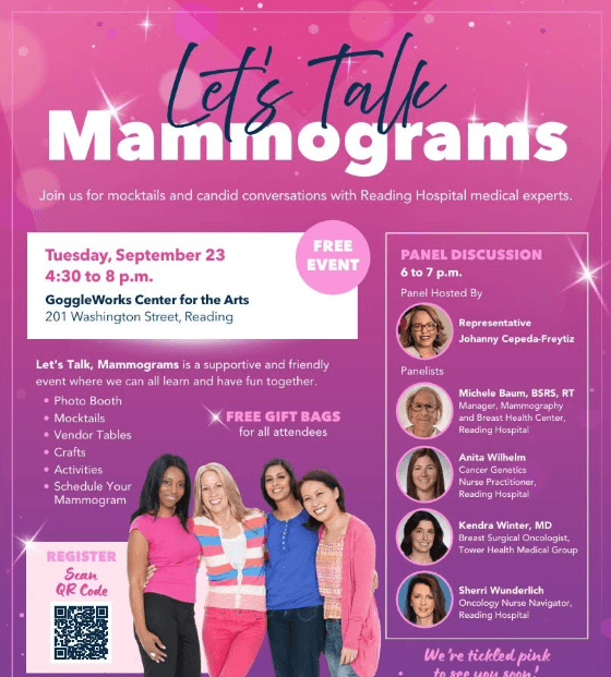 I will host the Panel Discussion “Let’s Talk Mammograms,” complete with mocktails and candid conversations with Reading Hospital medical experts, on Tuesday, September 23 from 4:30 PM – 8 PM at the GoggleWorks Center for the Arts, 201 Washington Street in Reading. There will be a photobooth, crafts, free gift bags, and more! I look forward to seeing you there!