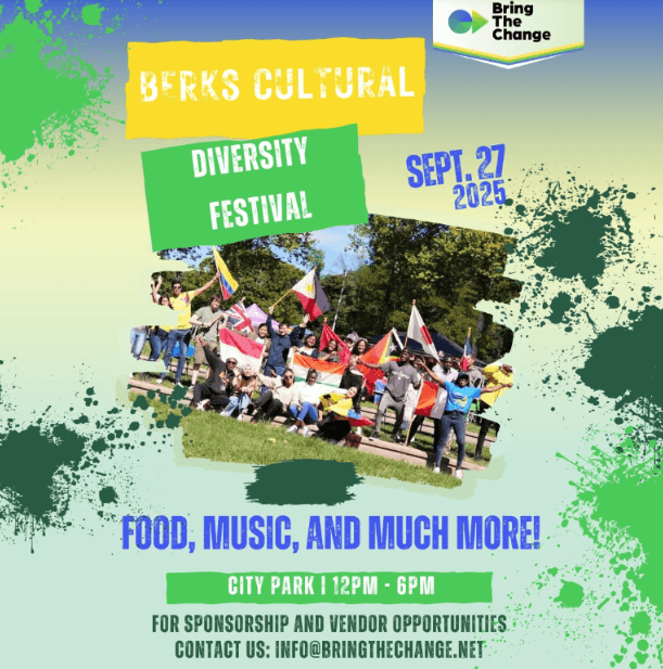 The Sixth Annual Berks Cultural Diversity Festival will be in Reading City Park at Washington Street and North 11th Street on Saturday, September 27 from 12 PM – 6 PM. There will be live music, performances, food from all around the world, information on available resources, and more!