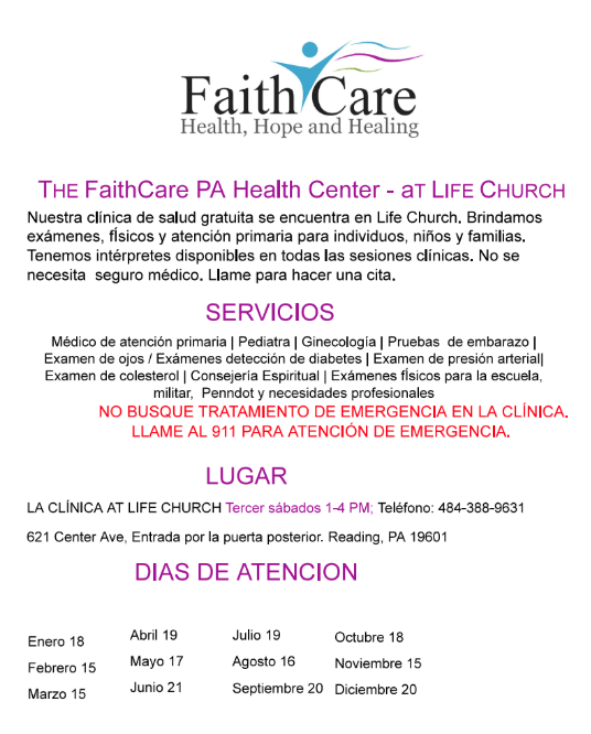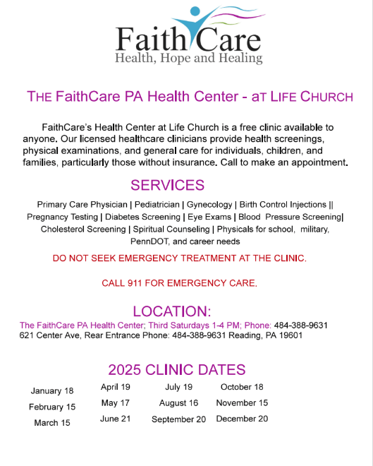 FaithCare’s Health Center at Life Church is a free clinic available to anyone at the FaithCare PA Health Center on every third Saturday of the month from 1 PM – 4 PM. Their licensed healthcare clinicians provide health screenings, physical examinations, and general care for individuals, children, families – particularly those without insurance. You can review the services available in the flier above. DO NOT seek emergency treatment at the clinic; call 911 for emergency care. Please call 484-388-9631 to make an appointment.