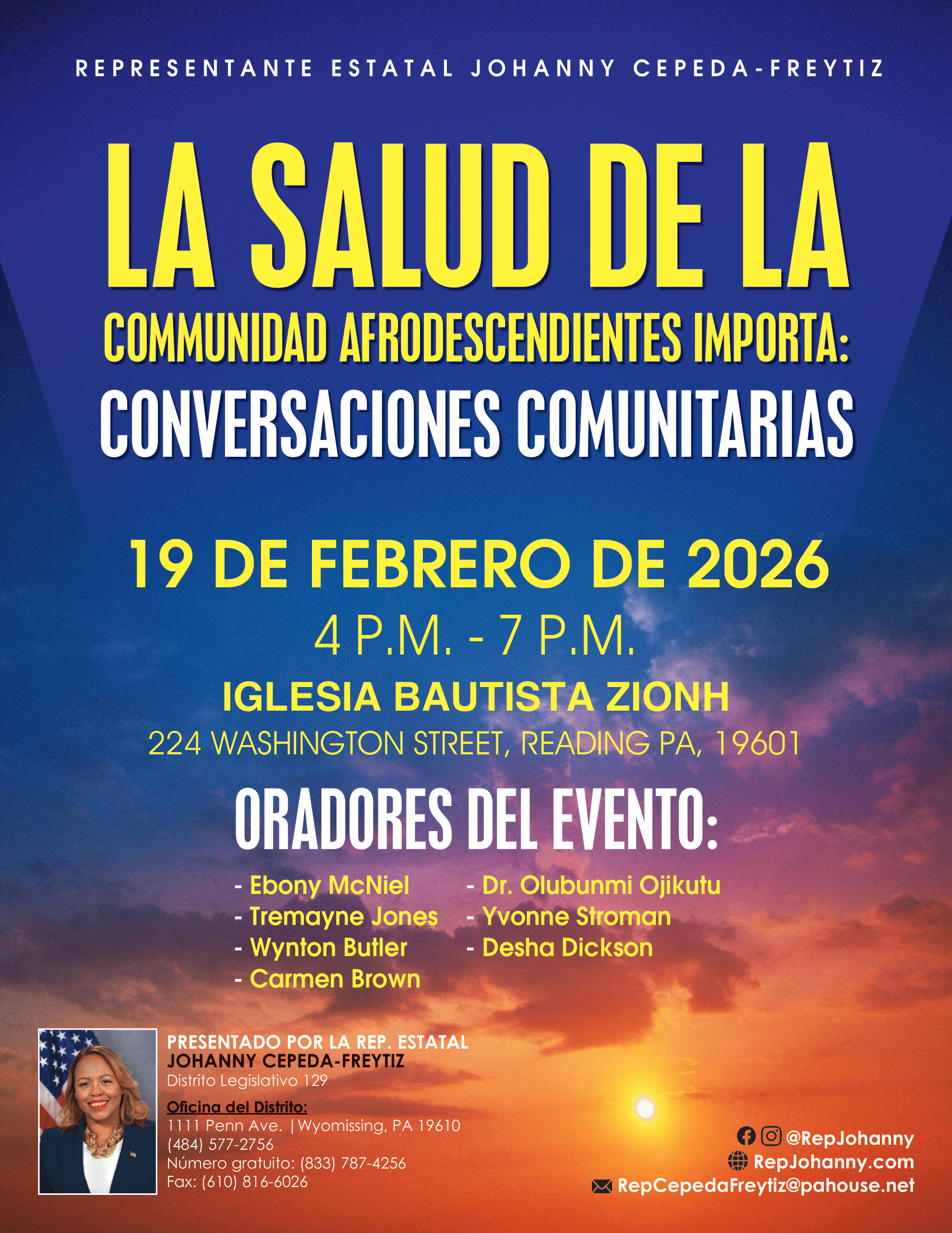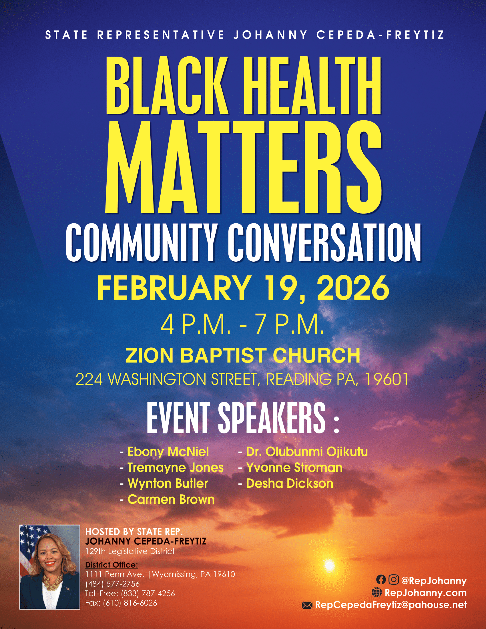 Black communities continue to face persistent health disparities rooted in systemic inequities. This Black Health Matters Community Conversation will bring neighbors together to discuss real solutions to improve Black health outcomes in our district and across Pennsylvania.