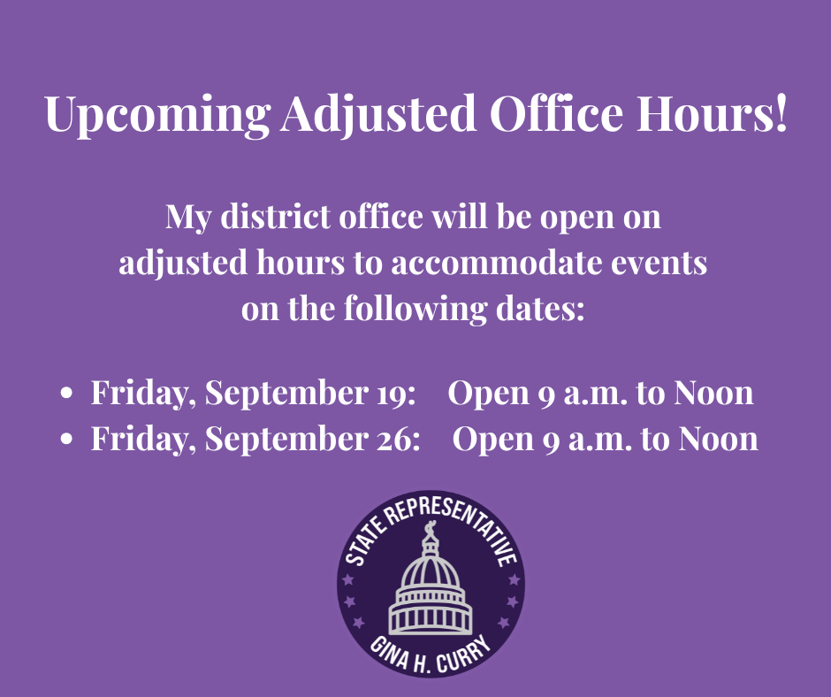 It’s events season, and my district office team and I will be unavailable in the afternoons on Friday, September 19 and Friday, September 26 while they coordinate and host the ones we have planned for this month! Both days we will be open from 9 a.m. to 12 p.m. We will open as usual at 9 a.m. the following Monday morning.