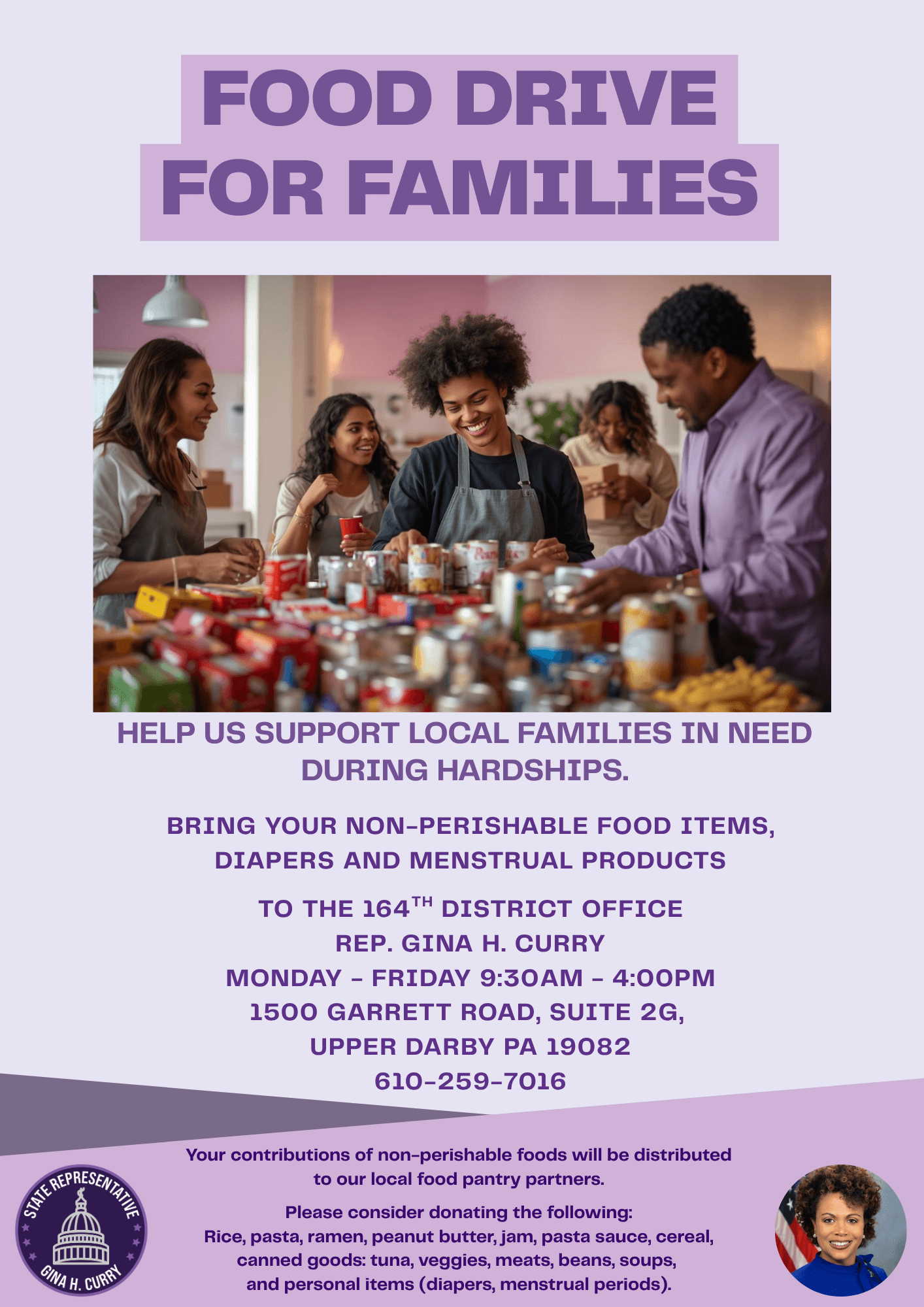 To help meet immediate needs, our office is collecting nonperishable food items that will be distributed to local food pantries serving families across Upper Darby, Lansdowne, East Lansdowne, Millbourne, and Drexel Hill. We invite you to drop off donations during business hours and join us in ensuring no one in our community goes hungry.