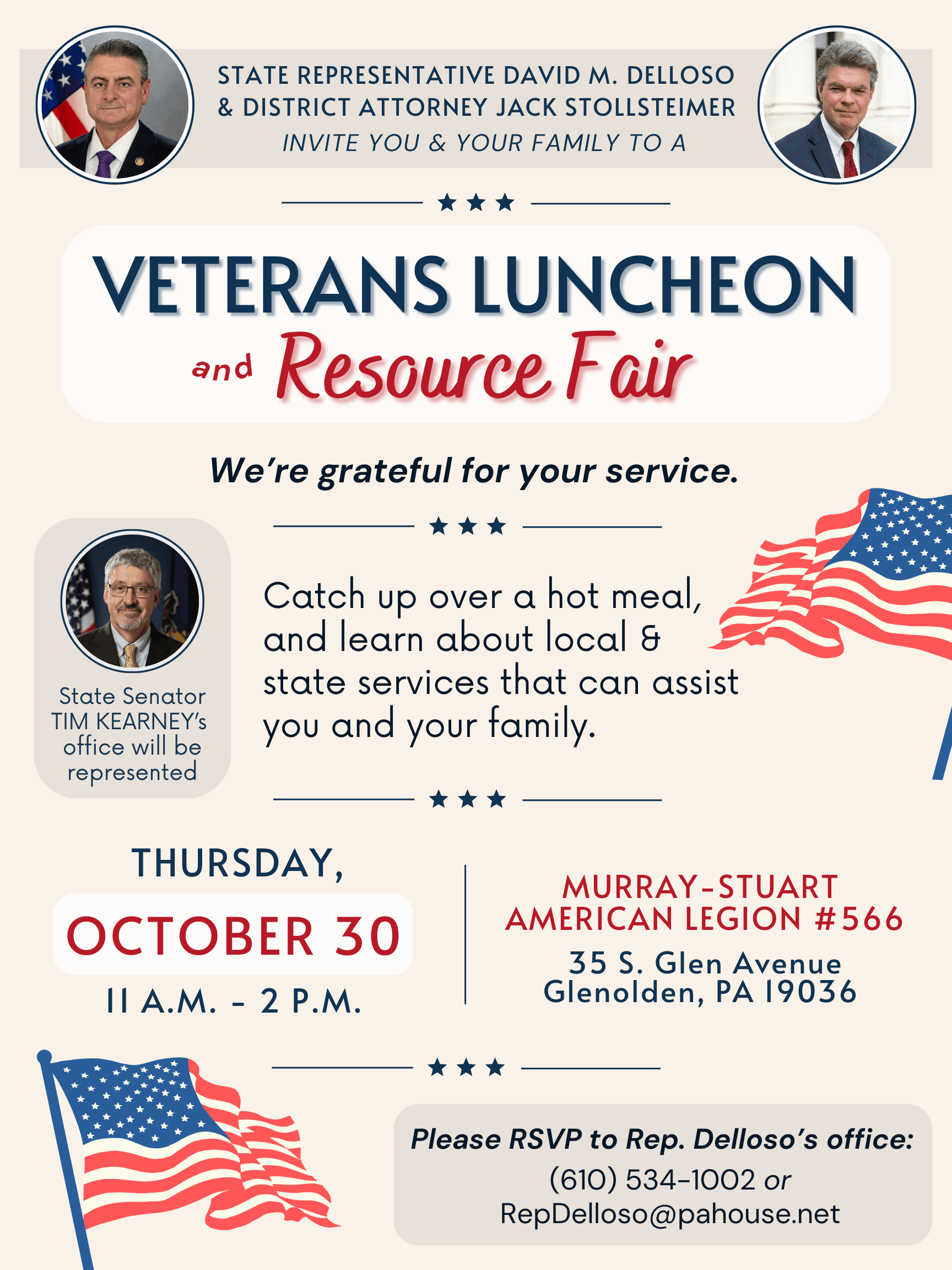 And of course, we will host our big Veterans Luncheon and Resource Fair at the end of the month. Veterans, not only will there be plenty of information and resources for you and your family, but we’re also providing a complimentary lunch from Mission BBQ. We are partnering on this event with District Attorney Jack Stollsteimer, and be on the lookout for a special guest appearance from Senator Tim Kearney. Please RSVP by calling or emailing my office if you have not done so already.