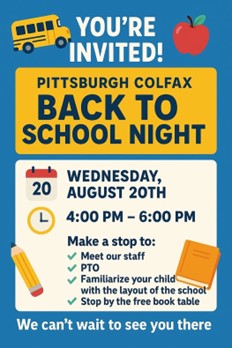 Colfax Back to School Night Wednesday, August 20, 4-6 PM | PPS Colfax   PPS Colfax will host its annual Back to School Night, offering students and families the opportunity to explore the school building and meet teachers ahead of the new academic year. Specific questions or detailed information regarding individual students should be addressed during a scheduled meeting or communicated in writing, not during Back to School Night.   Free and open to PPS Colfax students and their families.   Learn more here. |