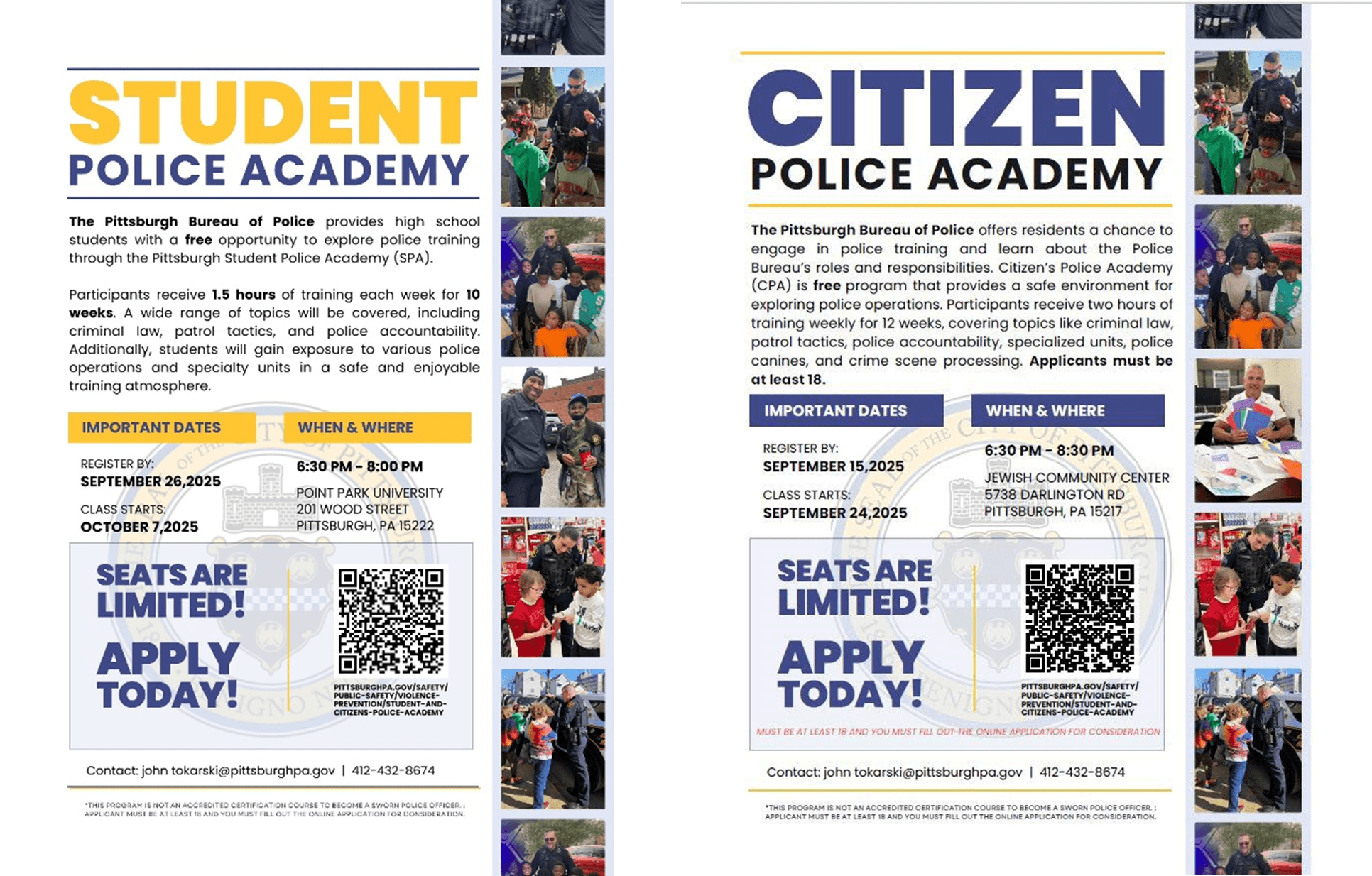 The Pittsburgh Bureau of Police invites residents and high school students to participate in interactive training and learn about the Bureau’s roles and responsibilities. Participants will explore topics such as criminal law, patrol tactics, police accountability, crime scene processing, and more—all in a safe, educational environment.   Both academies are free, but space is limited.   Learn more and register here. |