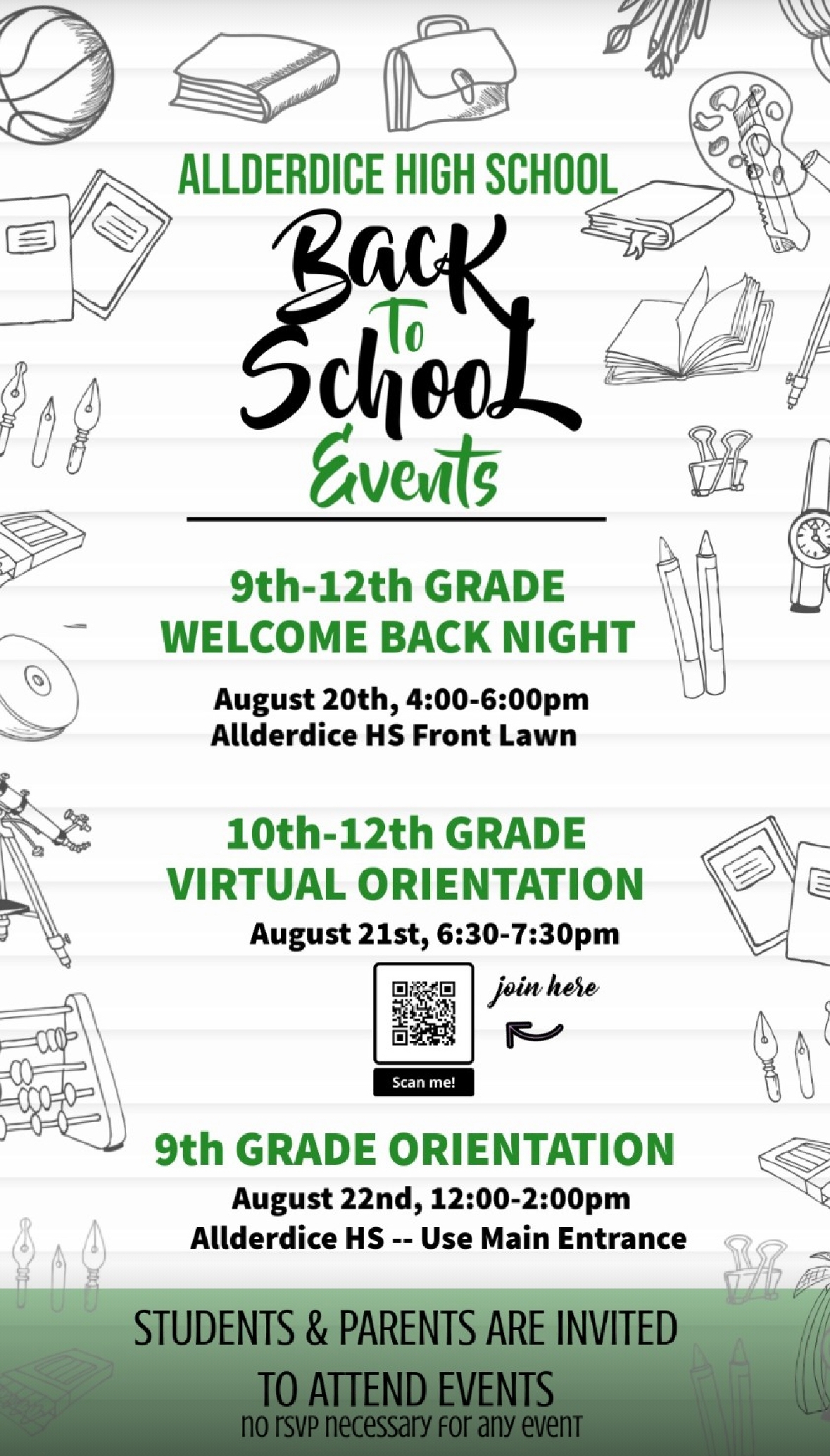 Friday, August 22, 12:00–2:00 p.m. | Allderdice High SchoolIncoming 9th graders are encouraged to attend orientation to tour the building, meet teachers, and learn about school resources.