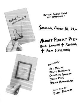 Almost Perfect Press will host an evening celebrating the release of two new books: What is Your Work? by Catherine Gammon, a collection of hybrid and experimental fictions, and My Dreams by Brent Nakamoto, featuring stories and reflections on dreams. Attendees will also find other titles available for purchase, including a new chapbook edition of The Thirty-Two Physical Characteristics of the Buddha. The program will include short readings by Ari Moline, Brent Nakamoto, Catherine Gammon, Jenna Peng, and Varun Ravindran, as well as a short film screening by David Bernabo.