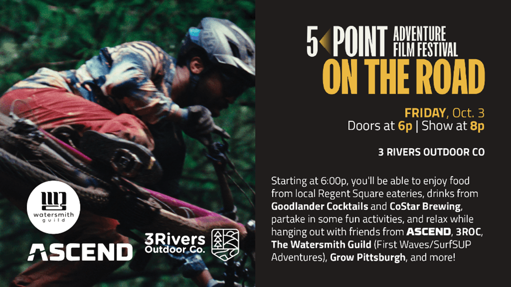ASCEND, 3 Rivers Outdoor Company, and The Watersmith Guild are hosting the 7th Annual 5Point Adventure Film Festival. The evening begins at 6 PM with food, drinks, live music, and activities, followed by a film screening at 8 PM. Guests are encouraged to bring their own chair or blanket.