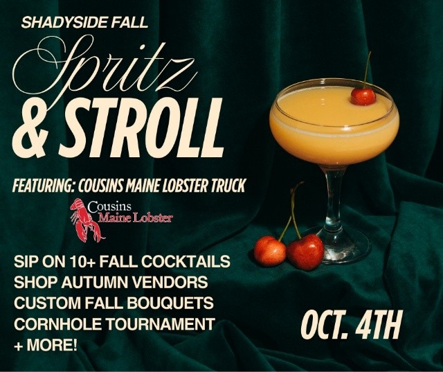 ThinkShadyside! invites neighbors to sip and shop on Walnut Street during the Fall Spritz and Stroll. Participants will receive a cup and wristband at check-in, then enjoy 10 spritz beverages across participating businesses, along with shopping, food trucks, and fall vendors. The event also features a corn hole tournament and Cousins Maine Lobster on-site.