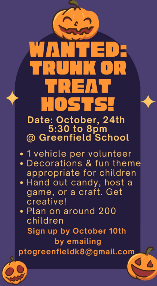 The Greenfield K8 PTO is seeking volunteers to host decorated trunks for this year’s Fall Fest. Volunteers are asked to bring one vehicle, decorate with a fun theme, and hand out candy, host a game, or lead a craft for children. Please plan for around 200 participants, arrive at least one hour early for setup, and stay for the full event. Space is limited, and all types of vehicles are welcome.