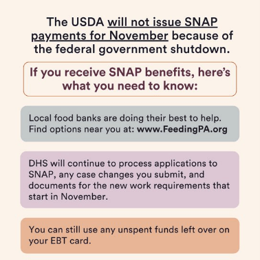 The United States Department of Agriculture has notified the states that November SNAP (Supplemental Nutrition Assistance Program) benefits will not be paid until the shutdown ends. The Pennsylvania Department of Human Services (DHS) is working to alert recipients and will continue to process applications and renewals, although payments cannot be issued.