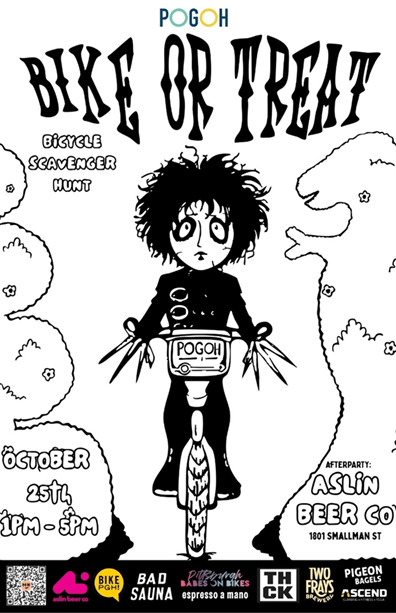 Bike or Treat is a fun, inclusive, scavenger-hunt-style ride celebrating all things Halloween. Participants can start anywhere, ride at their own pace, and collect tickets at six checkpoints around the city for a chance to win raffle prizes at the afterparty. Costumes are encouraged, and riders can use a POGOH bike or bring their own. The event concludes with music, games, and a prize raffle at Aslin Beer Co.