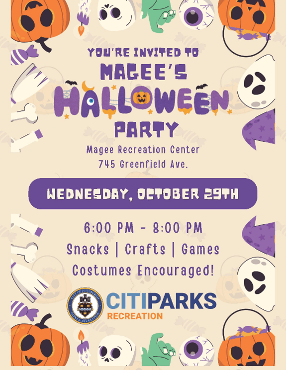 Families are invited to celebrate Halloween at Magee Recreation Center with gym games, snacks, a center-wide scavenger hunt, and spooky crafts. Family-friendly costumes are encouraged for both kids and parents. All ages are welcome, but children must be accompanied by an adult.