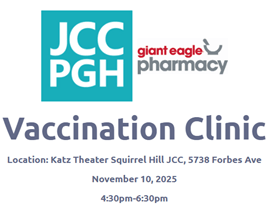 Giant Eagle and the JCC will host a Flu and Covid-19 vaccine clinic for the community. Insurance card required.