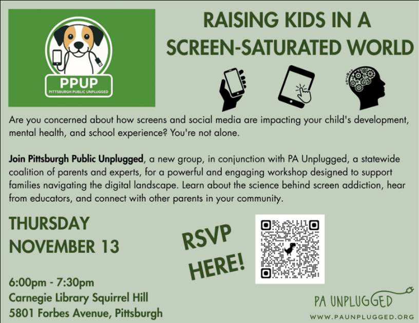 Families are invited to a workshop hosted by Pittsburgh Public Unplugged in partnership with PA Unplugged, a statewide coalition of parents and experts. The session will explore the impact of screens and social media on children’s development, mental health, and school experience. Attendees will learn about the science of screen addiction, hear from educators, and connect with other parents navigating the digital landscape.