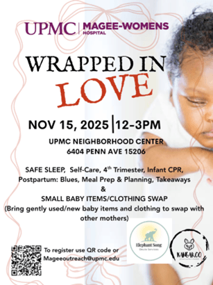 Magee-Womens Hospital will host a community event to help new parents navigate the “fourth trimester.” The program will include info-sessions on safe sleep practices, infant CPR, and meal planning for families with newborns. Guests are invited to participate in a baby clothes swap and are encouraged to bring gently used or new baby items to share.