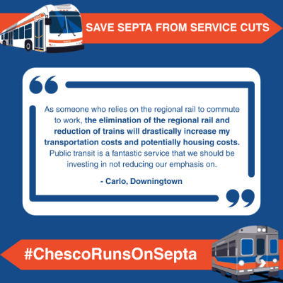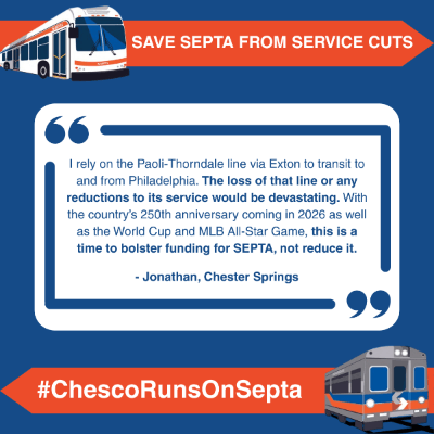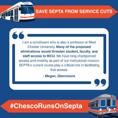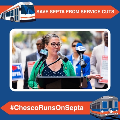 Our workers, students, and seniors in Chester County rely on SEPTA to get to jobs, schools and medical appointments, and our small businesses rely on SEPTA to bring their employees to work. If we fail to reach a funding agreement and provide critical support for transit, it will mean more traffic on our roads and a huge hit to the economy in southeastern PA, which is the major economic engine for the rest of the state. SEPTA service cuts would be an enormous loss for our region and for our Commonwealth.
