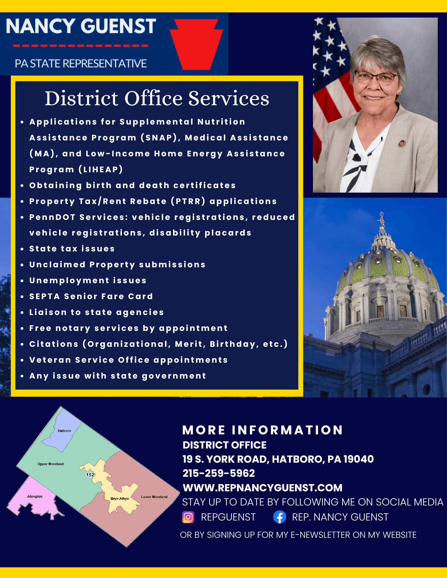 As always, feel free to call our office at 215-259-5962 for help with state services or send me an email at Repguenst@pahouse.net.