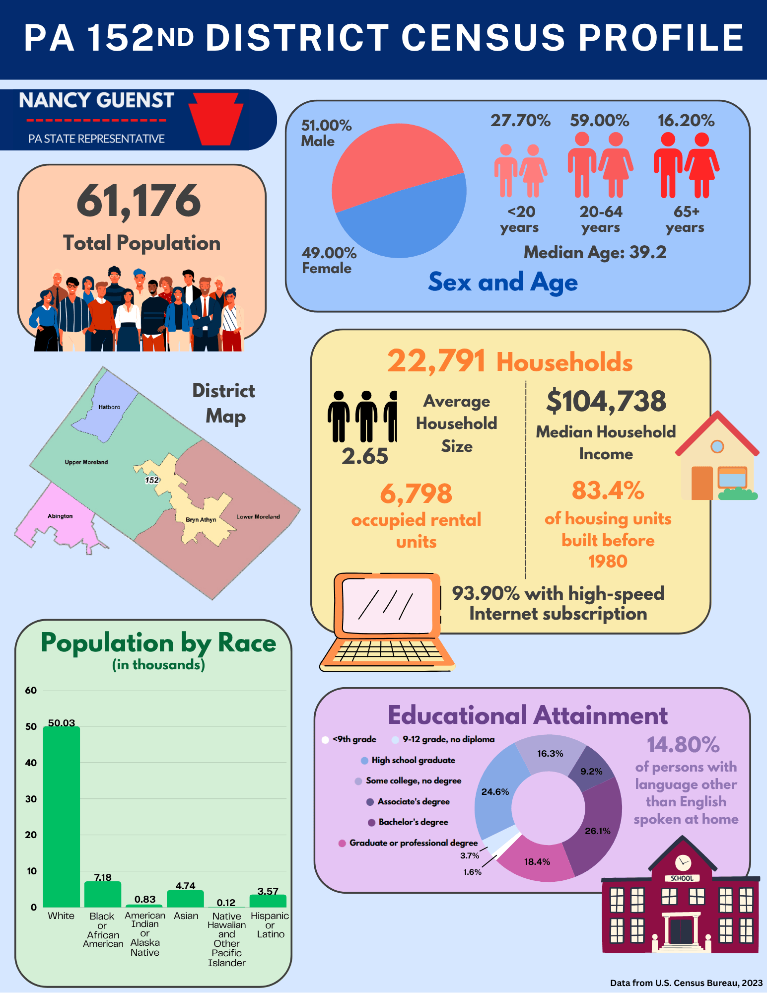 Liya was our intern in the Spring of 2025. At the time of her internship, she was a senior at Lower Moreland High School and is now in her freshman year at the University of Pennsylvania studying Biology. She researched and designed a flyer that showcases a demographic profile of our district.