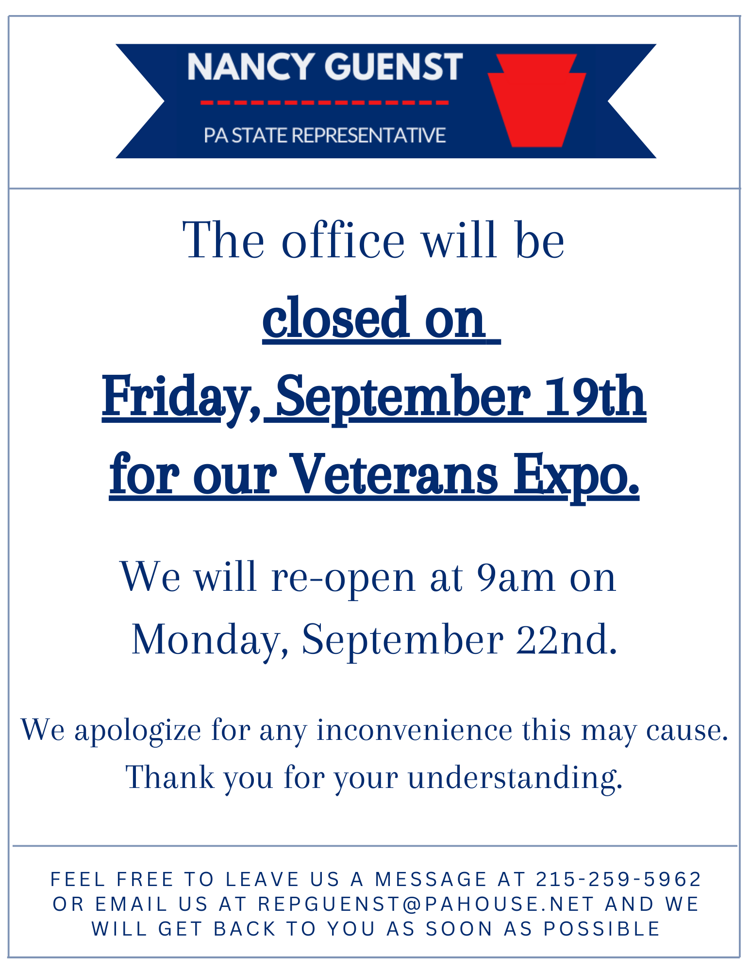 Mark your calendars and join me, Rep. Brian Munroe, and Rep. Melissa Cerrato at our Veterans Expo on THIS FRIDAY, September 19th from 11am-2pm! This event is for veterans and will be held at the VE Club - 130 Davisville Road in Warminster.