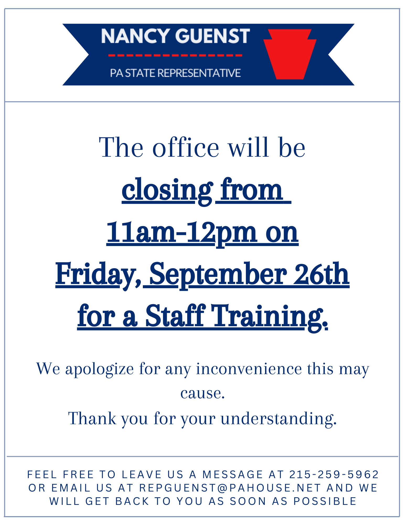 The office will be CLOSING from 11 a.m. to 12 p.m. this Friday, September 26th for a Staff Training.