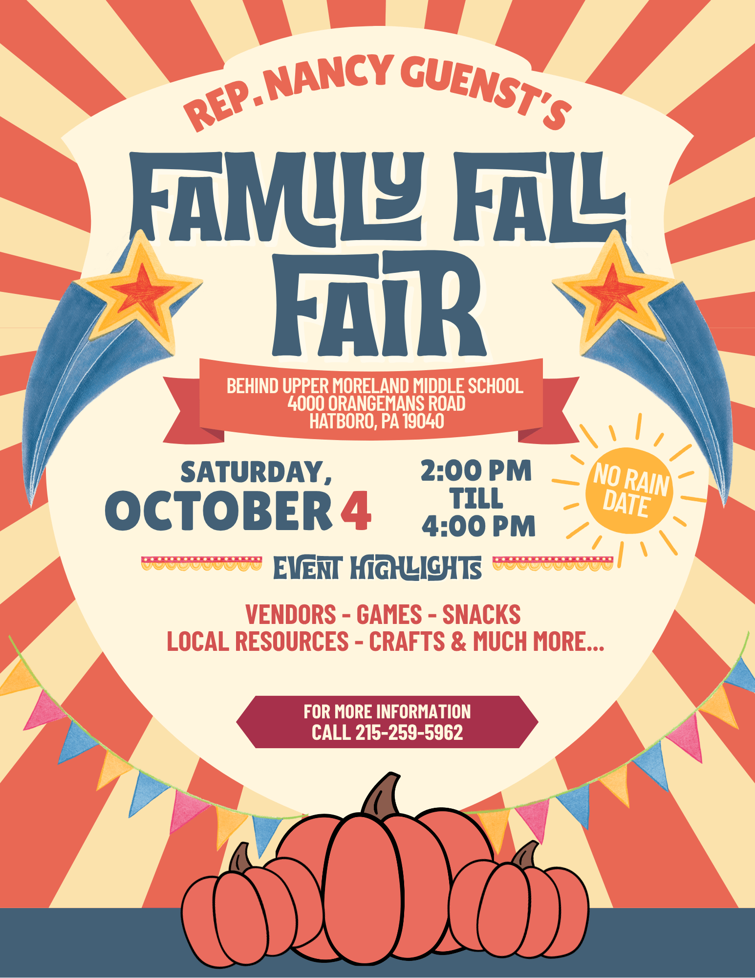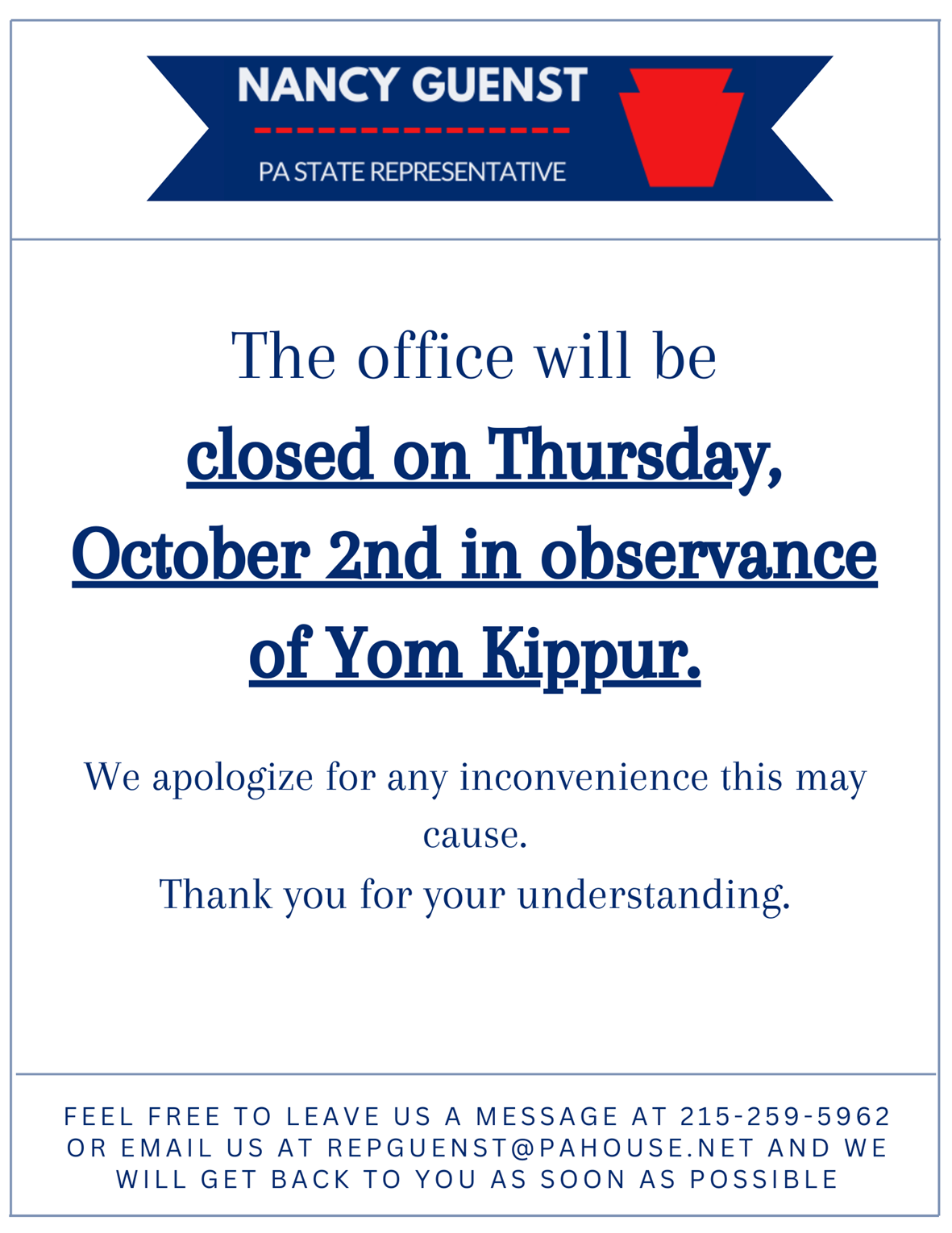We have some exciting events coming up around the district, so be sure to stay informed through my newsletter and social media. As always, feel free to call our office at 215-259-5962 for help with state services or send me an email at RepGuenst@pahouse.net.