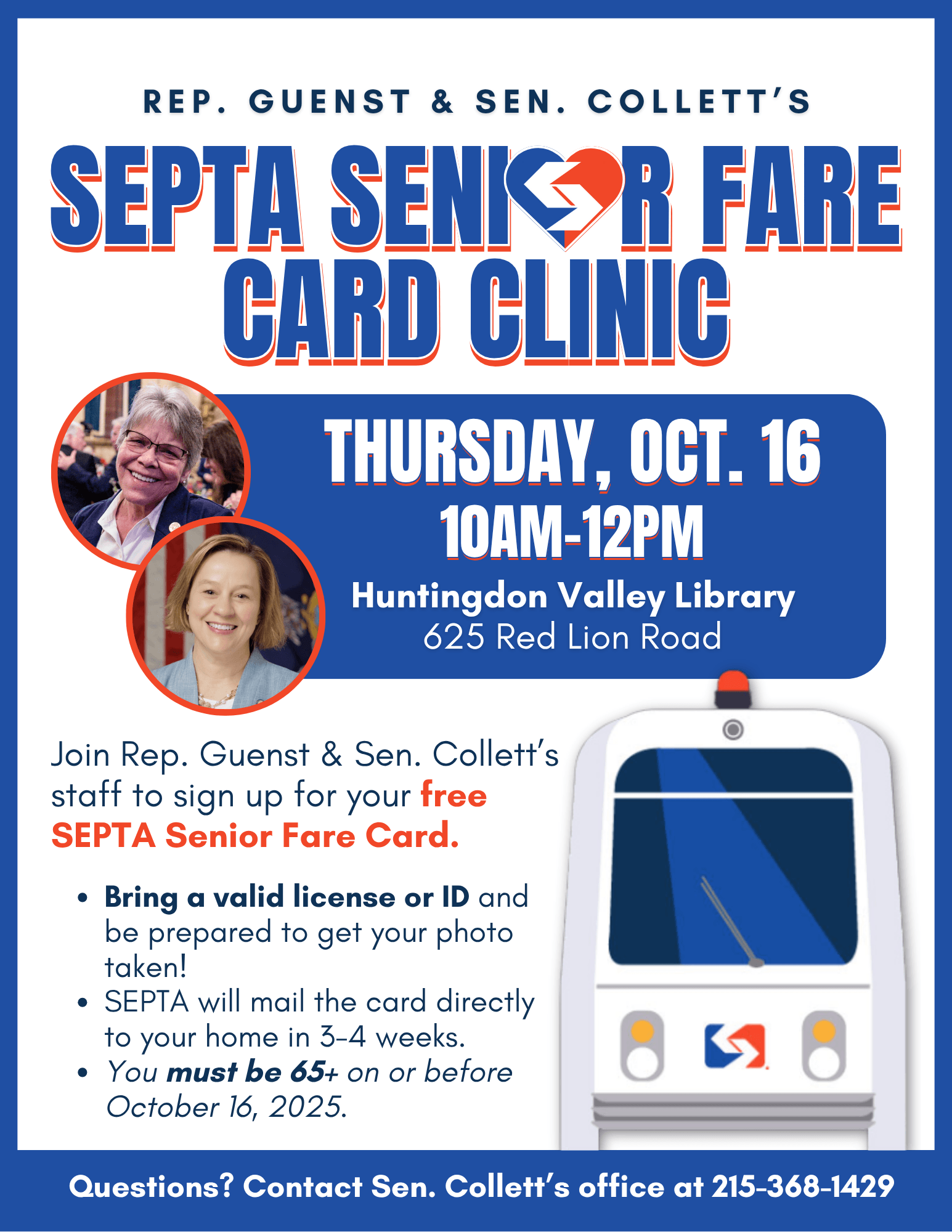 Along with Senator Maria Collett, we will be hosting a SEPTA Senior Fare Card Clinic on Thursday, October 16th from 10am-12pm at the Huntingdon Valley Library on Red Lion Road.
