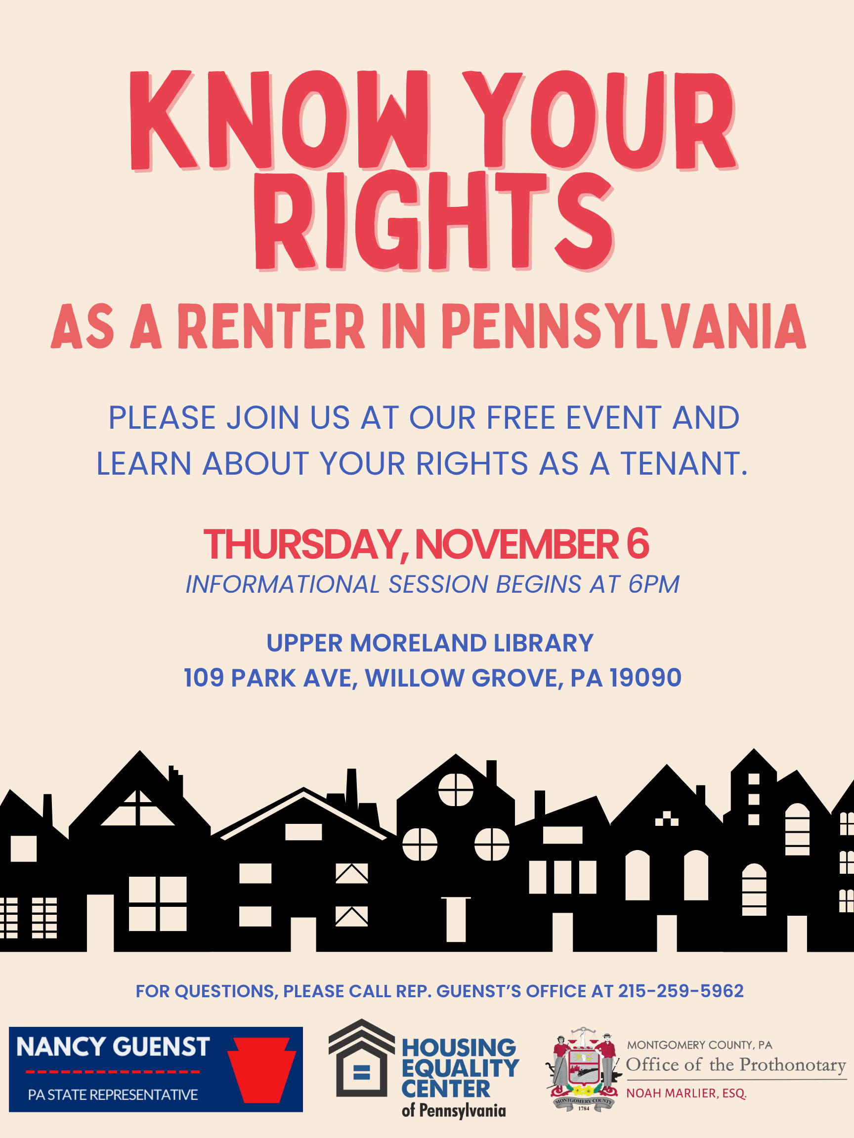 The Housing Equality Center and the Prothonotary’s Office will be on hand to give an informational session about your rights as a tenant and answer questions.