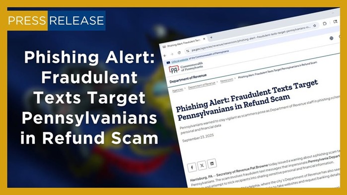 The Pennsylvania Department of Revenue is warning about a phishing scam targeting Pennsylvanians. The scam involves fraudulent text messages that impersonate Pennsylvania Department of Revenue officials and attempt to trick recipients into sharing sensitive personal and financial information.