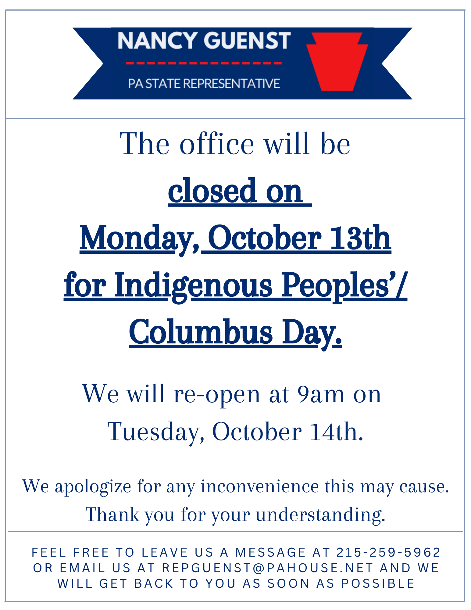 We have some exciting events coming up around the district, so be sure to stay informed through my newsletter and social media. As always, feel free to call our office at 215-259-5962 for help with state services or send me an email at RepGuenst@pahouse.net.