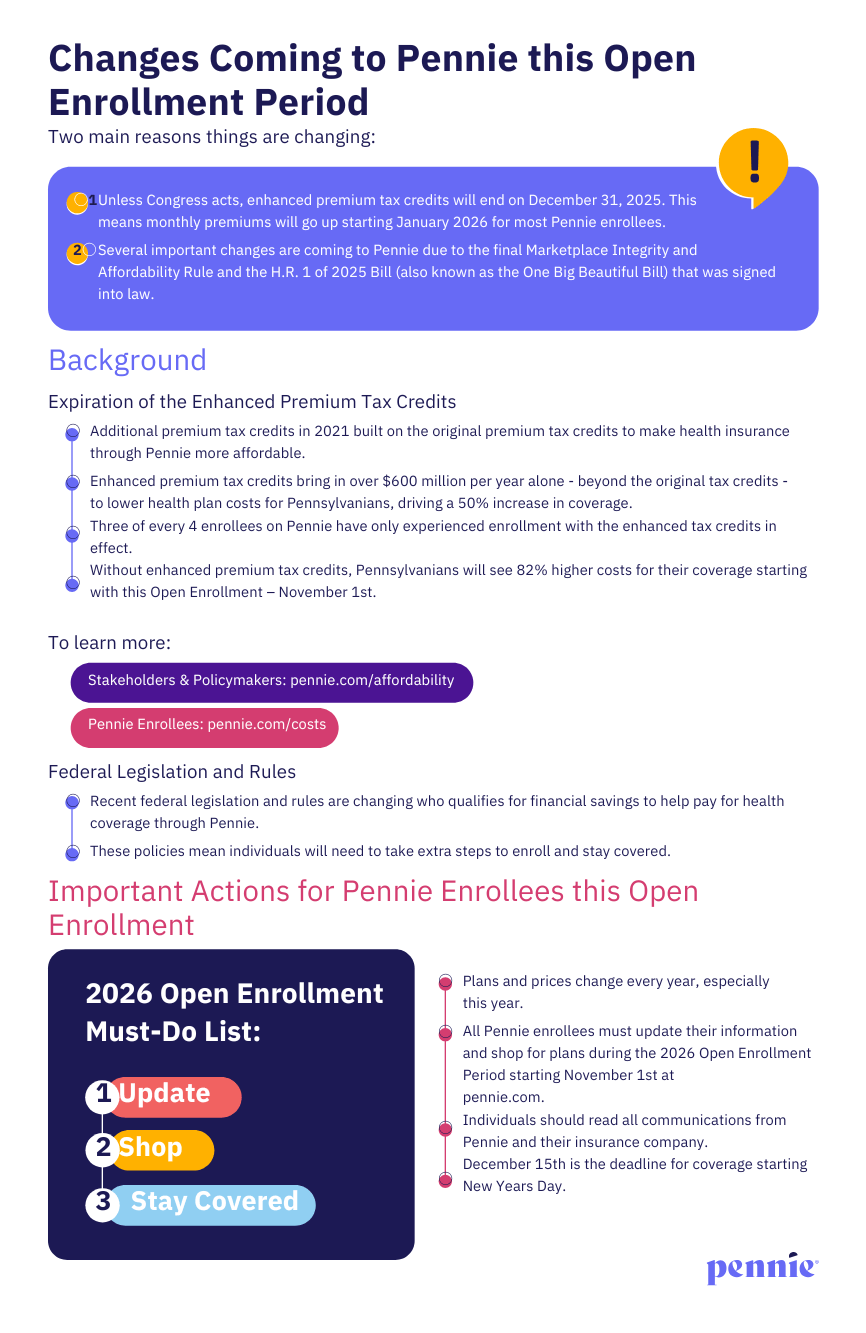 Keep an eye out for and read all information you receive from Pennie and/or your health insurance company. You'll learn more about these potential impacts as 2026 Open Enrollment (starting Nov. 1, 2025) approaches.