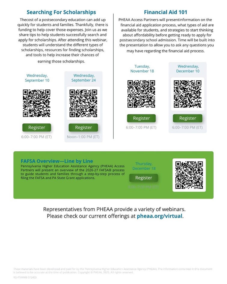 The Pennsylvania Higher Education Assistance Agency (PHEAA) is offering webinars throughout the end of the year to assist families with student aid and financial assistance.