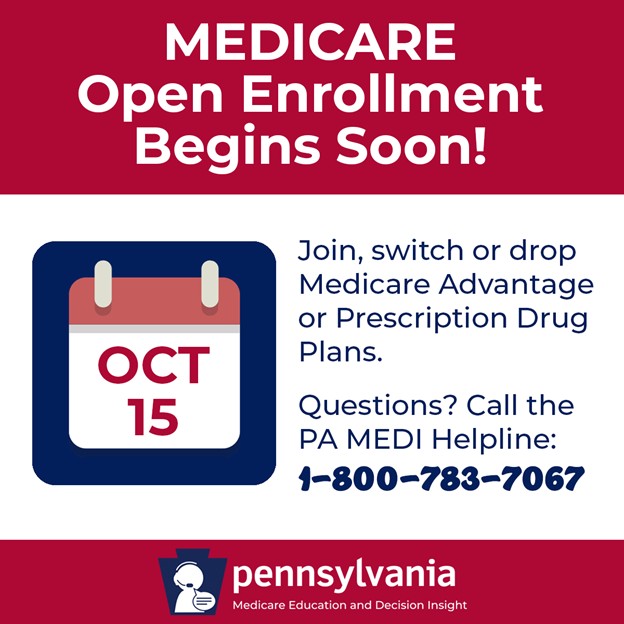 Open enrollment for Medicare will start October 15, 2025 and PA MEDI can help answer your questions about your plan.