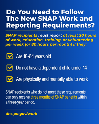 If you receive SNAP benefits, are between the ages of 18 and 64, do not have a dependent child under 14, and are physically and mentally able to work, you must now report at least 20 hours per week of work, education, training, or volunteering.