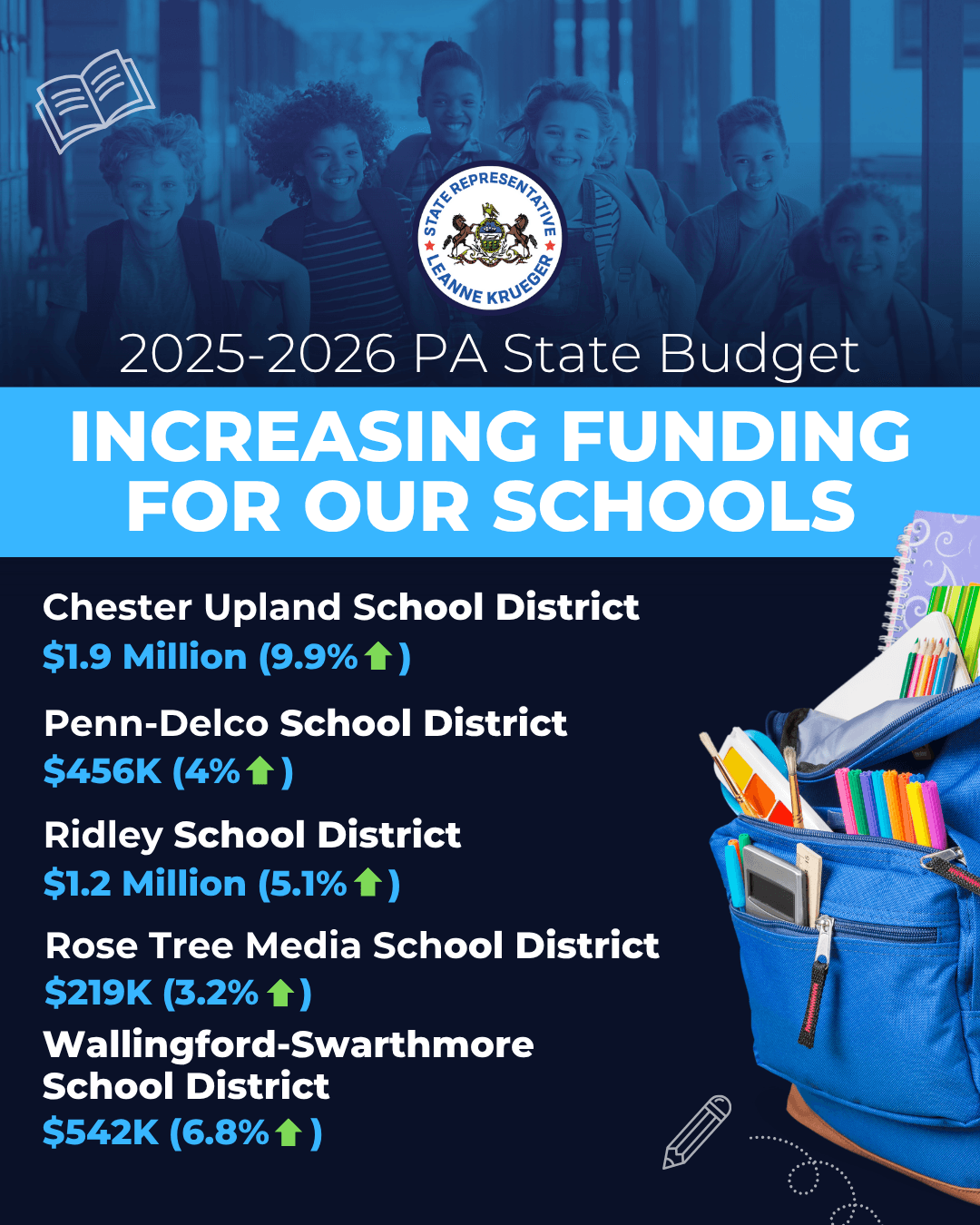 Education matters, and it remains one of my top priorities. That’s why I’m grateful for the increased investments made in our local school districts – Chester Upland, Penn-Delco, Ridley, Rose Tree Media, and Wallingford-Swarthmore. These funds will help strengthen classrooms, support students, and provide the resources our schools need to thrive. Every single district saw an increase in this year’s budget.