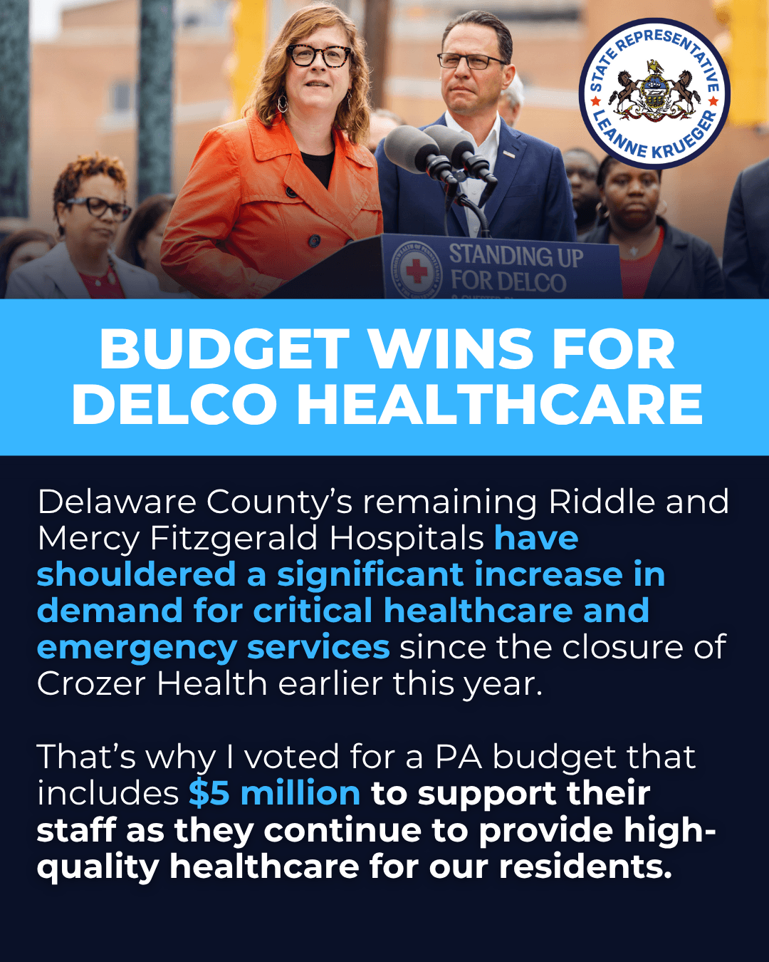 - $5 million in funding for our two remaining hospitals in Delaware County as they absorb increased volume following the closure of Crozer-Chester and Taylor Hospitals.