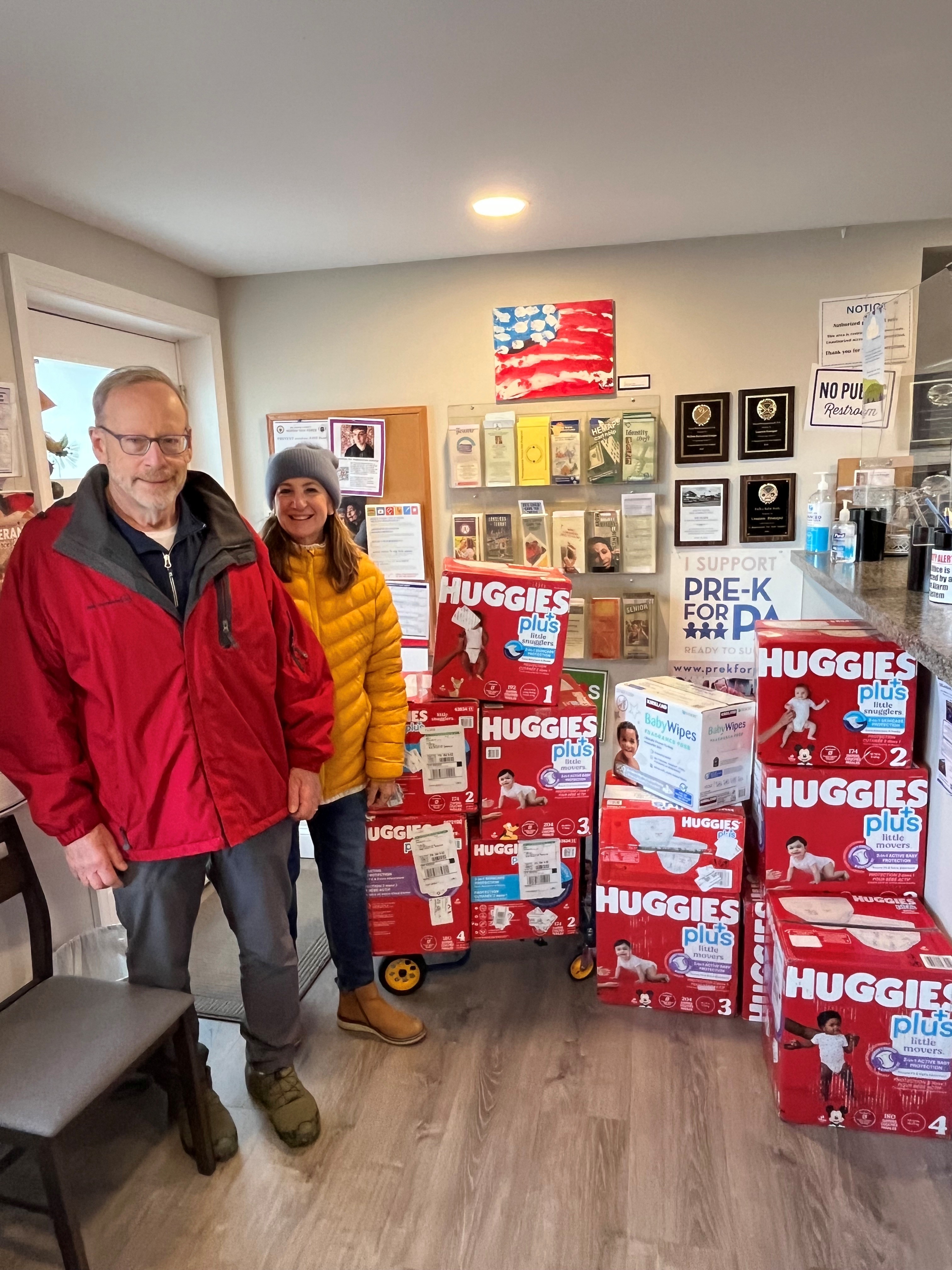 Thank you to Lynn Finelli and David Swerdlow and their family – Kris, Kathleen, and Susan Mervine, Roe Falcone, and Julie and Amy Swerdlow – for generously dropping off many boxes of diapers for our Diaper Drive, which continues until December 12th.