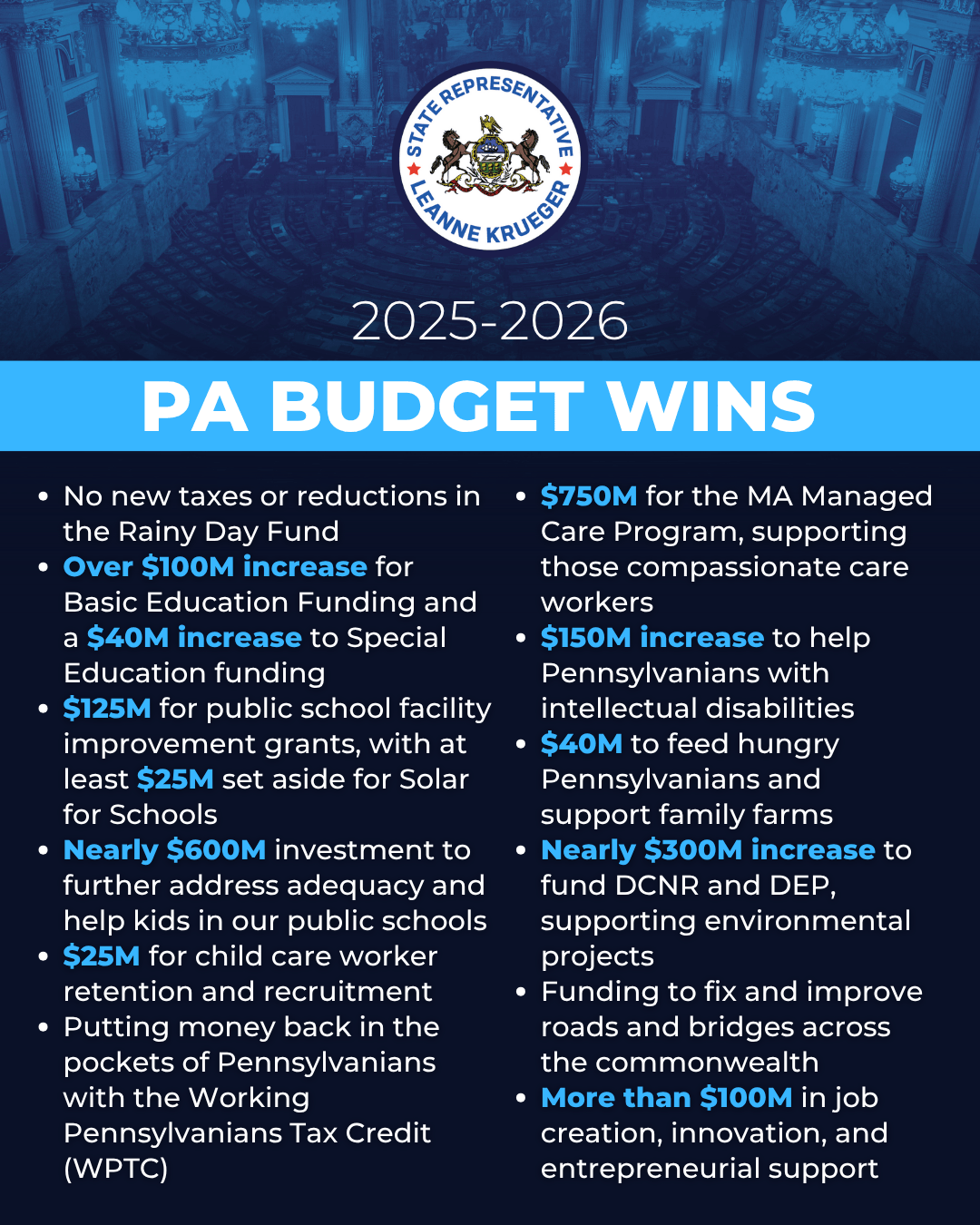 After four months without a budget, this budget represents a meaningful investment in people and communities across Pennsylvania. I’m grateful for my colleagues who worked tirelessly to ensure resources reach the communities that need them most.