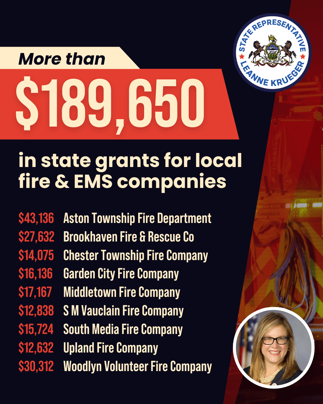 I have great news for our community - more than $189,650 in state grants is heading to our local fire and EMS companies.