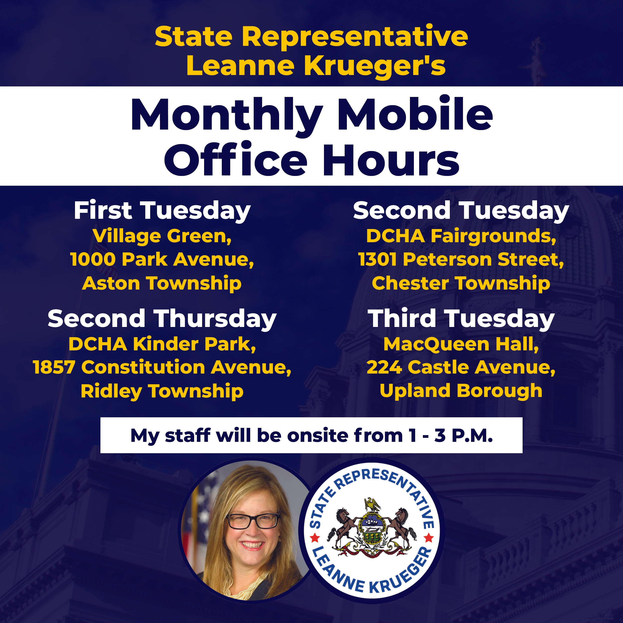 MIPC will also hold monthly office hours at the Aston Township Administration Building, located at 3264 Concord Rd., on the first Monday of each month. The next session is Monday, March 2, from 8:30 AM – 4:30 PM.